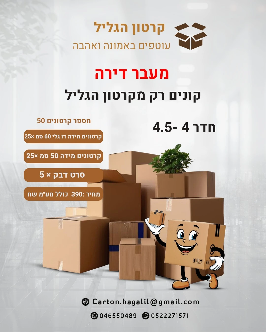קרטון הגליל מציע לכם פתרון נוח ומשתלם למעבר מסודר. בחרו את החבילה שמתאימה לגודל הדירה שלכם ואספו מהחנות בנצרת.